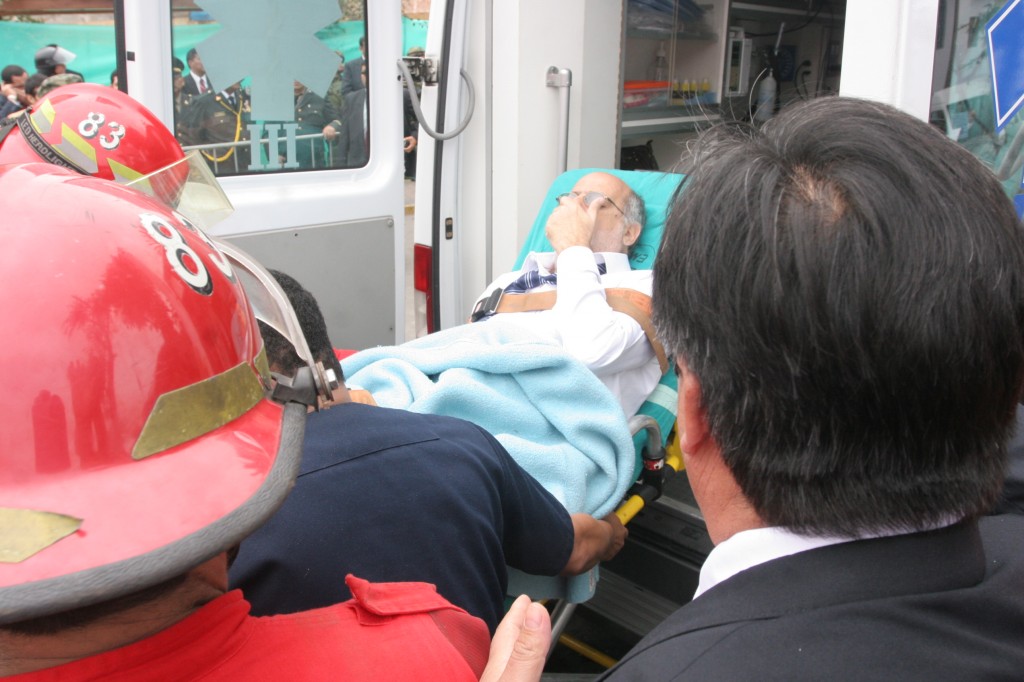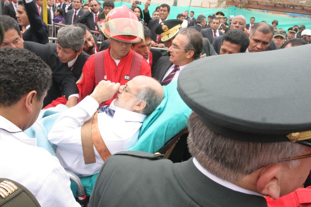 Era la tercera vez que cubría el desfile militar y bueno las expectativas de encontrar algo diferente eran grandes, así que me pasé caminando de un lado a otro, hasta que me cansé y me detuve junto a el camarógrafo del canal cuatro. Mirábamos el desfile tranquilamente, cuando de repente un agitado reportero le dice que lo siga. Los dos salen corriendo, yo también los sigo. Al llegar a la parte trasera del estrado oficial vimos que del toldo salía muy pálido y débil el congresista Abugattas, así que empezamos a obtener las imágenes de ese momento.