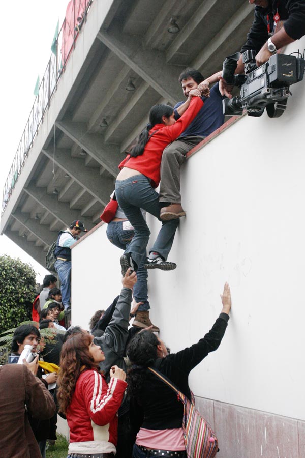 Por cierto, yo me quedé afuera esperando la llegada de Evo y de Ollanta. Según el plan de mi jefe y editor de fotografía ese día yo era la indicada para sortear los golpes, empujones, caídas y lo que venga a la hora de fotografiar al mandatario boliviano.