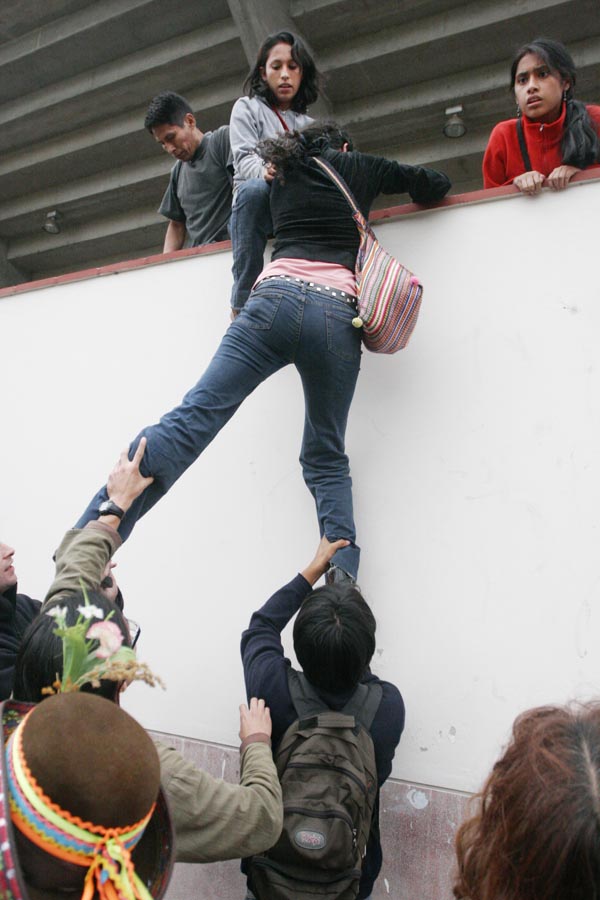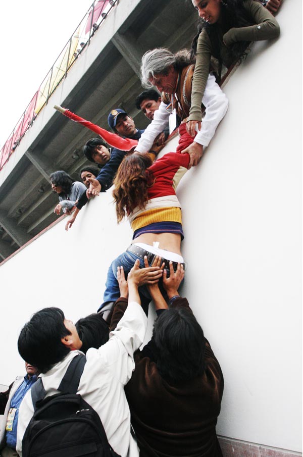 Finalmente luego de un accidentado ascenso, la joven llega a la cima del muro y desaparece sin dar gracias o reclamo alguno a sus espontáneos colaboradores.