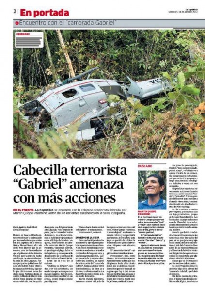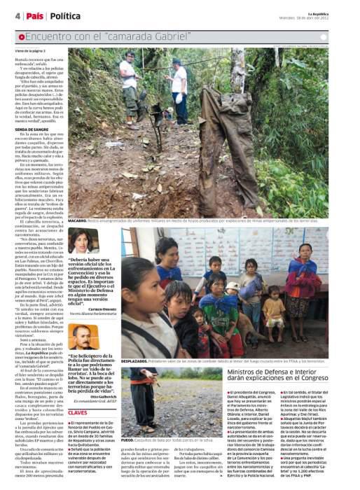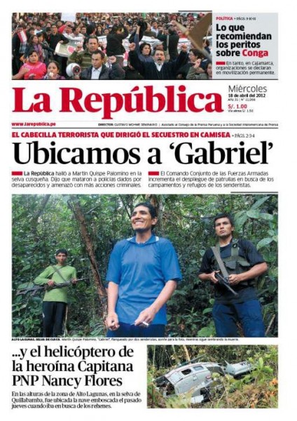 Página 3 del diario La República del miércoles 18 de abril. Muestra el armamento que los senderistas poseen y el camino que hicieron los periodistas hasta la zona.