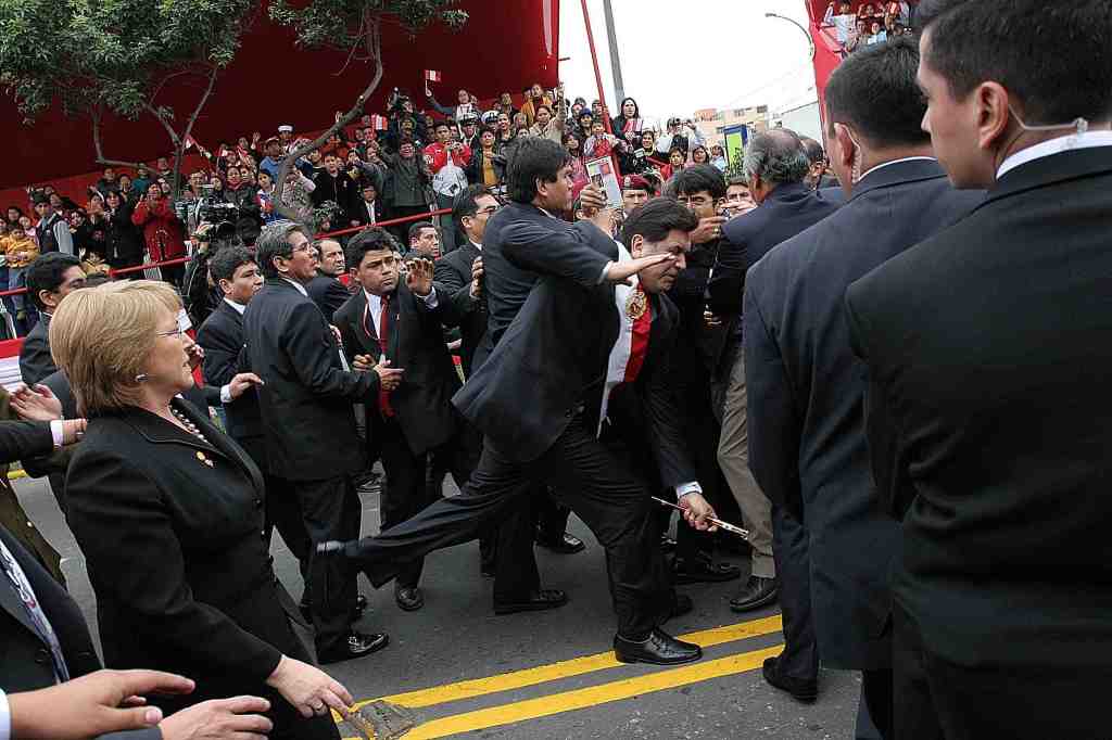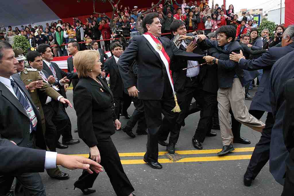 Muchos deben recordar las fotos del ex presidente Alan García, siendo alcanzado por un efusivo admirador; quien burlando la seguridad presidencial, se acercó al ex mandatario y de un jalón casi lo hace caer. Todo ante la mirada atónita de la presidente de Chile, Michelle Bachellet, y del público presente en el desfile militar del 2006.