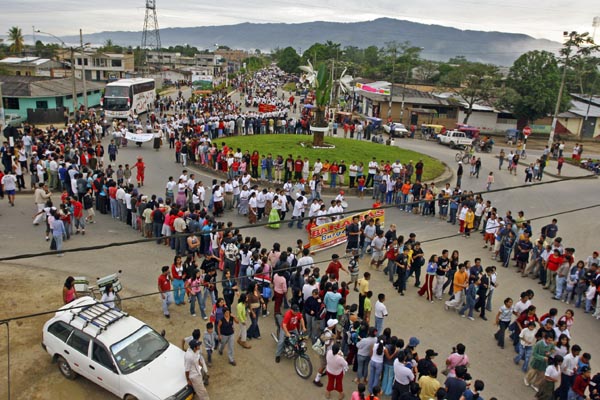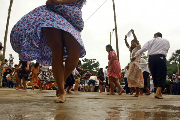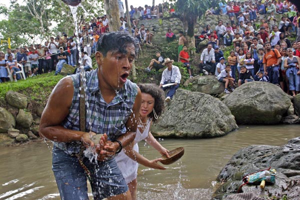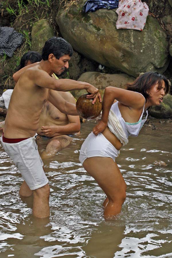 Salen de sus casas de madrugada, se agrupan y parten en compañía de tambores hacía el río.