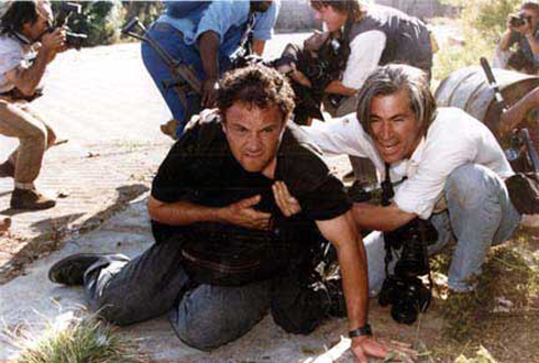 El fotógrafo James Nachtwey ayuda a Greg Marinovich herido de bala. En segundo plano se ve a Jaoa Silva tomando fotos a ken, siendo auxiliado. Esa es la imagen que aparece arriba. Foto: Juda Ngwenya
