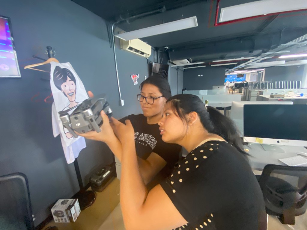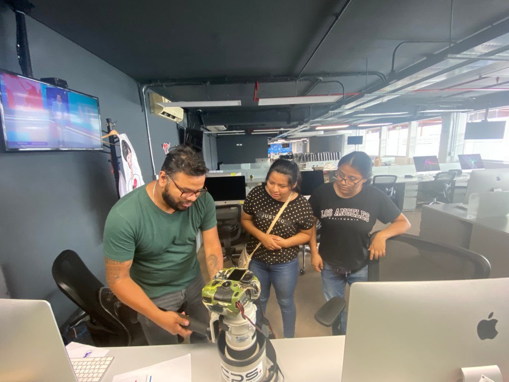 También les mostró los sofisticados equipos que usan para cubrir los eventos noticiosos. Las alumnas quedaron fascinadas mirando los lentes de largo alcance, drones, equipos de edición, los accesorios de seguridad, que usan para las marchas y protestas, como chalecos antibalas, cascos y máscaras antigás.En la redacción también estuvo Lenin Tadeo, profesional que trabaja en la elaboración de los videos informativos que suben a Youtube, él les mostró los diferentes trabajos que desarrollan con una nueva narrativa visual, donde usan fotos, videos y música.