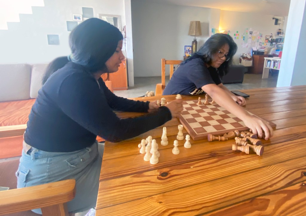 Elaboraba ejercicios y desafíos que los motivaba a encontrar diferentes repuestas a una misma pregunta. De esta manera aprendíamos de técnica y composición, con stickers, figuras y objetos. Aprendíamos a elaborar una historia gráfica, analizando las ubicaciones de las piezas de ajedrez, así es, con ajedrez, ¡es posible! Mirábamos fotografías y usábamos la memoria para recordar los elementos importantes, algo así como un Ponte Mosca fotográfico. Creábamos bodegones con todo lo que tuviéramos al alcance o trazábamos una línea para pasar al otro lado sin movernos. Retos sencillos que buscaban soluciones diferentes sin necesidad de que sean correctas.