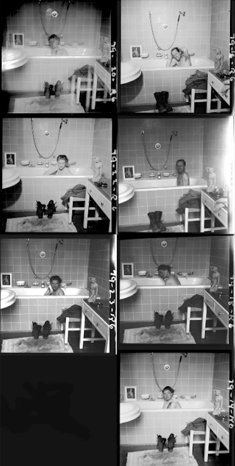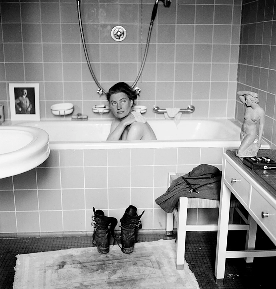 Miller subió al baño donde todo parecía inalterado: una toalla doblada con precisión, un jabón intacto, la bañera impecable, como si la guerra no hubiera tocado aquel rincón. Con decisión y sin perder el tiempo, le dijo a Scherman que preparara su cámara mientras ella componía el encuadre: tomó un retrato de Hitler y lo colocó junto a la bañera, movió la silla, la jabonera y una estatua. Luego restregó sus botas sucias sobre la alfombra blanca y las dejó junto a la bañera. Se despojó de su ropa, la acomodó sobre la silla y se sumergió en el agua. Entonces miró a su compañero y le pidió que le tomara la foto.